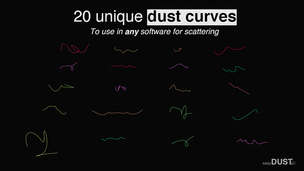 - 20 unique dust curves for you to use and scatter in your software of choice (Blender, Maya, 3ds Max, etc) and get awesome results.